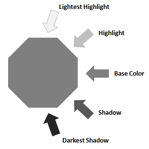 A helpful version of zenithal lighting is the “stop sign rule.” This really helps to illustrate that how light or dark a surface should be is dependent on the angle that is made with respect to the light. Take a look at the attached image to see what I mean.